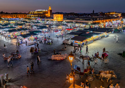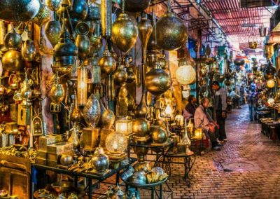 After lunch in a traditional restaurant, explore the vibrant Jemaa el-Fna Square and the surrounding souks, where artisans display spices, carpets, leather goods, and handcrafted jewelry. Dinner and overnight in Marrakech.